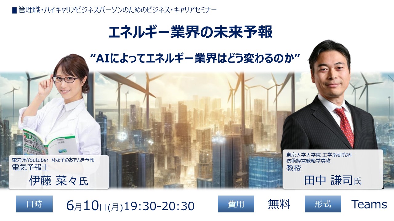 東京大学大学院 教授「田中 謙司氏」と電力系Youtuber「伊藤菜々氏」をお招きし『AIでエネルギー業界はどう変わるのか』講演会を6月10日(月)19:30より開催いたします。